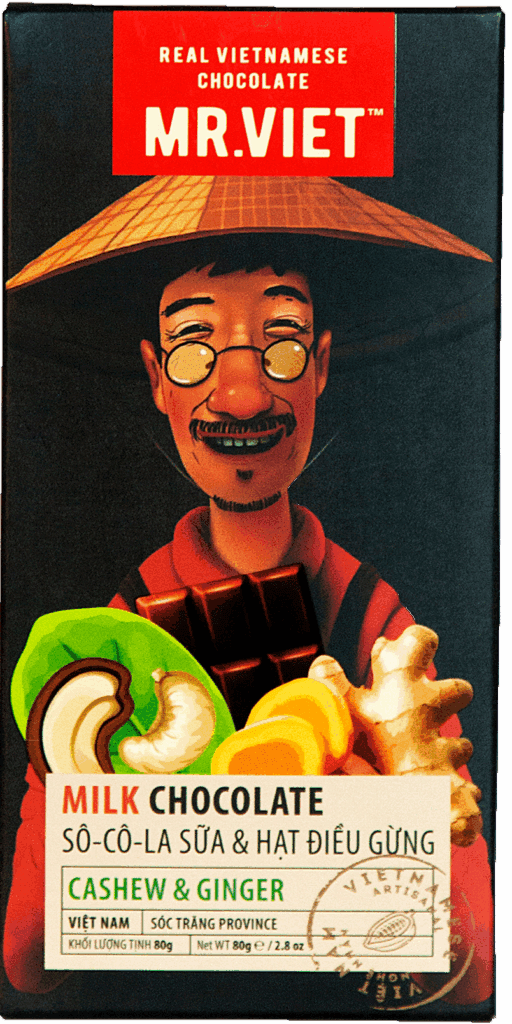 Creamy milk chocolate meets roasted Vietnamese cashews and a warming ginger kick.